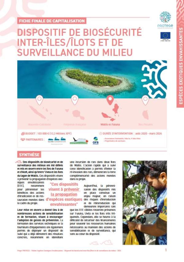 Des dispositifs de biosécurité et de surveillance des milieux ont été définis et mis en œuvre entre les îles de Futuna et d’Alofi, ainsi qu’entre ‘Uvea et les îlots du lagon de Wallis. Ces dispositifs visent à prévenir la propagation d’espèces exotiques envahissantes (EEE), notamment pour pérenniser les bénéfices des actions d’éradication et de restauration menées dans le cadre du projet. Leur mise en œuvre a donné lieu à de nombreuses actions de sensibilisation et de formation, visant à encourager l’adoption de gestes de prévention. La formation des services techniques et la fourniture d’équipements ont également permis de déployer un dispositif de suivi qui a déjà démontré des résultats concrets, notamment en identifiant une incursion de rats dans deux îlots de Wallis. L’action rapide qui a suivi cette identification a permis d’éviter la ré-invasion des rats, démontrant la forte complémentarité des actions menées dans le projet. FICHE FINALE DE CAPITALISATION DU PROJET PROTEGE, financé par l'Union Européenne.