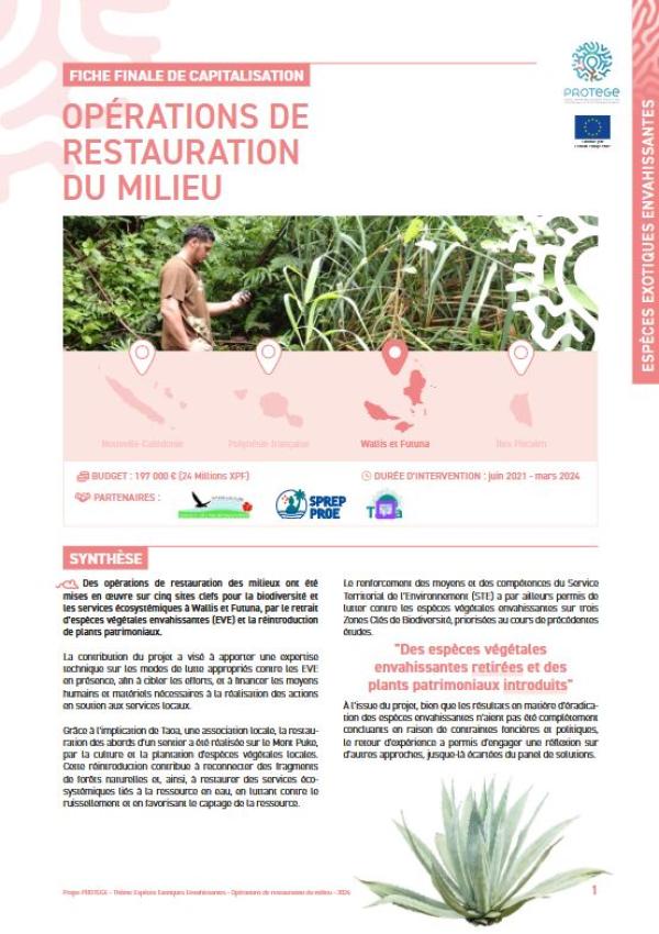 Des opérations de restauration des milieux ont été mises en œuvre sur cinq sites clefs pour la biodiversité et les services écosystémiques à Wallis et Futuna, par le retrait d’espèces végétales envahissantes (EVE) et la réintroduction de plants patrimoniaux. La contribution du projet a visé à apporter une expertise technique sur les modes de lutte appropriés contre les EVE en présence, afin à cibler les efforts, et à financer les moyens humains et matériels nécessaires à la réalisation des actions en soutien aux services locaux. Grâce à l’implication de Taoa, une association locale, la restauration des abords d’un sentier a été réalisée sur le Mont Puke, par la culture et la plantation d’espèces végétales locales. Cette réintroduction contribue à reconnecter des fragments de forêts naturelles et, ainsi, à restaurer des services écosystémiques liés à la ressource en eau, en luttant contre le ruissellement et en favorisant le captage de la ressource. Le renforcement des moyens et des compétences du Service Territorial de l’Environnement (STE) a par ailleurs permis de lutter contre les espèces végétales envahissantes sur trois Zones Clés de Biodiversité, priorisées au cours de précédentes études.