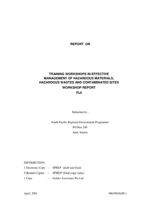 REPORT ON REPORT ON TRAINING WORKSHOPS IN EFFECTIVE MANAGEMENT OF HAZARDOUS MATERIALS, HAZARDOUS WASTES AND CONTAMINATED SITES WORKSHOP REPORT FIJI Submitted to : South Pacific Regional Environment Programme PO Box 240 Apia, Samoa DISTRIBUTION: 1 Electronic Copy - SPREP (draft and final) 5 Bound Copies - SPREP (final copy only) 1 Copy - Golder Associates Pty Ltd April, 2001 00639026(BU)April, 2001 - i - 00639026(BU) Golder Associates TABLE OF CONTENTS SECTION PAGE 1.0 INTRODUCTION ......................................................................................... 1 2.0 WORKSHOP PARTICIPANTS ................................................................... 1 2.1 Organisations Represented .................................................................... 1 2.2 Organisations Not Represented ............................................................. 1 3.0 MAJOR ISSUES IDENTIFIED .......................
